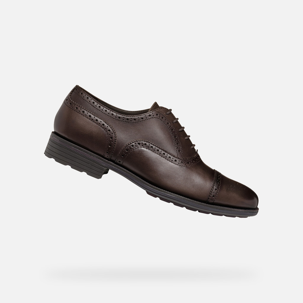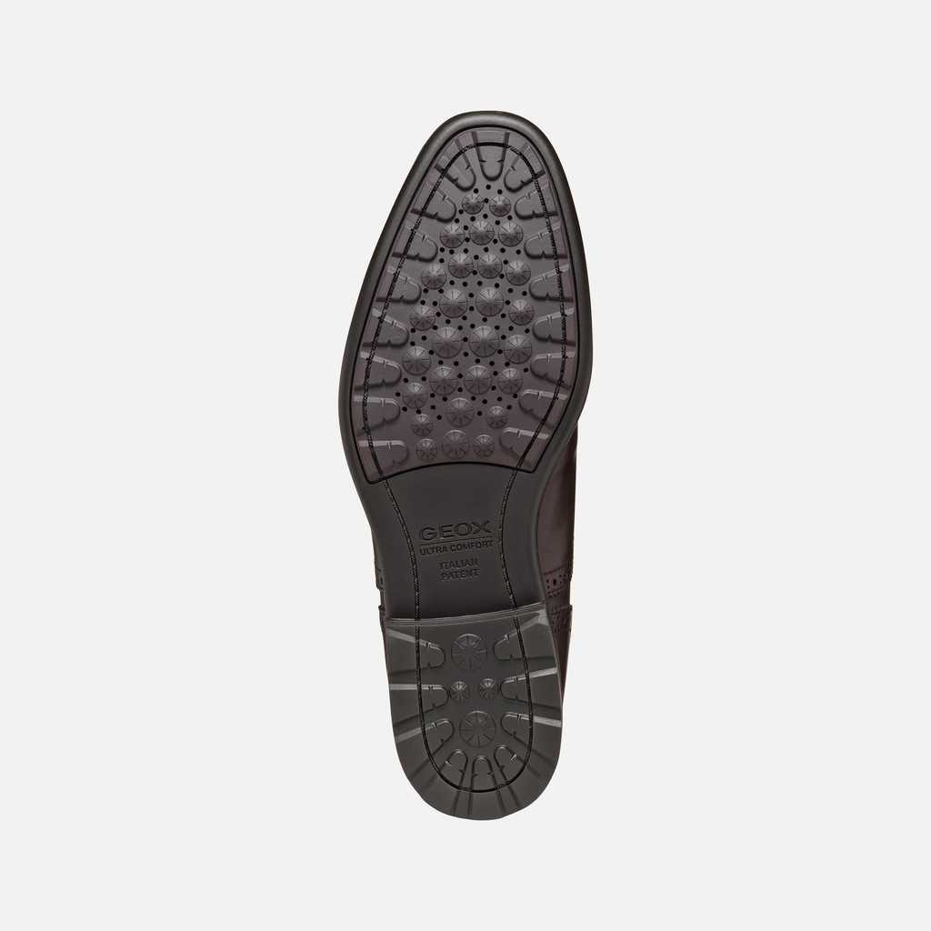 La duradera suela con altura de Geox, de goma, es fruto de una patente exclusiva: la combinación entre la suela perforada y una resistente membrana transpirable e impermeable permite la regulación natural de la temperatura, con lo que se crea un microclima ideal en el interior del zapato que logra mantener el pie seco durante toda la jornada.