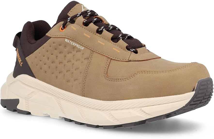 Las zapatillas de trekking Aleje en marrón claro combinan dinamismo y resistencia. Con un corte textil y PU, este calzado ofrece protección contra la humedad, el rocío, el frío y la llovizna, además de ser cortavientos. La suela de doble densidad y su diseño ergonómico aseguran un confort excepcional y un agarre firme en terrenos variados.