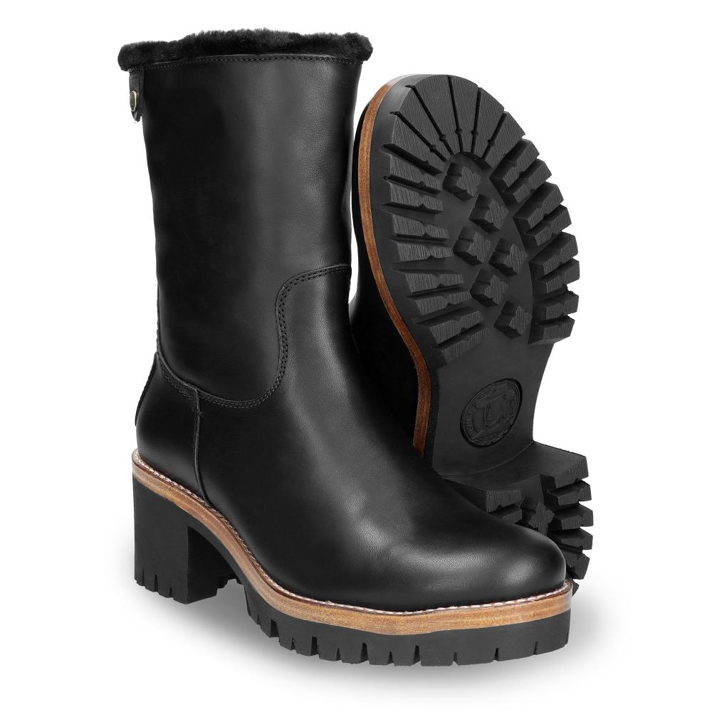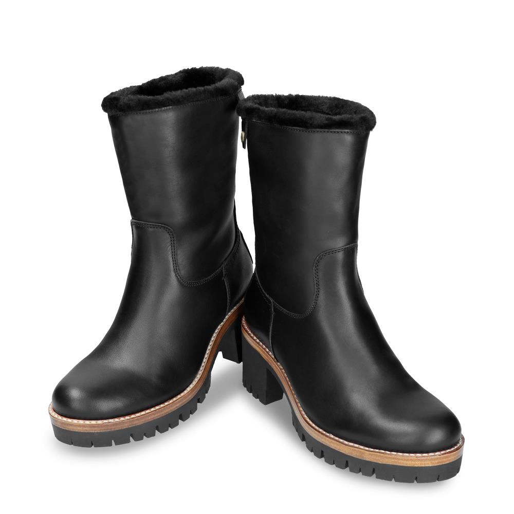 Botas de mujer con forro cálido. Bota de mujer con tacón, realizada en piel napa engrasada WATERPROOF, que repele el agua, y forro interior de pelo. Plantilla forrada de pelo y acolchada, que ayuda a la absorción de los impactos. Suela de goma, flexible, resistente y adherente. Altura caña 24 cm. Altura tacón 6,5 cm. Fabricado en España.