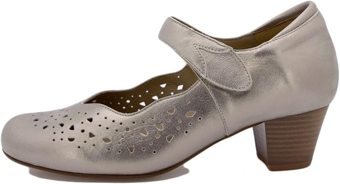 Exquisito Mary Jane en tono plateado metalizado, con perforaciones en patrones triangulares y circulares y cierre de tira ajustable para un uso sencillo. Su tacón bajo y robusto aporta estabilidad y elegancia. Artísticamente elaborado en España, es la elección ideal para combinar moda y confort para mujeres.