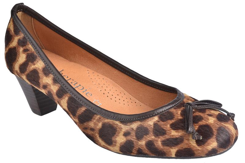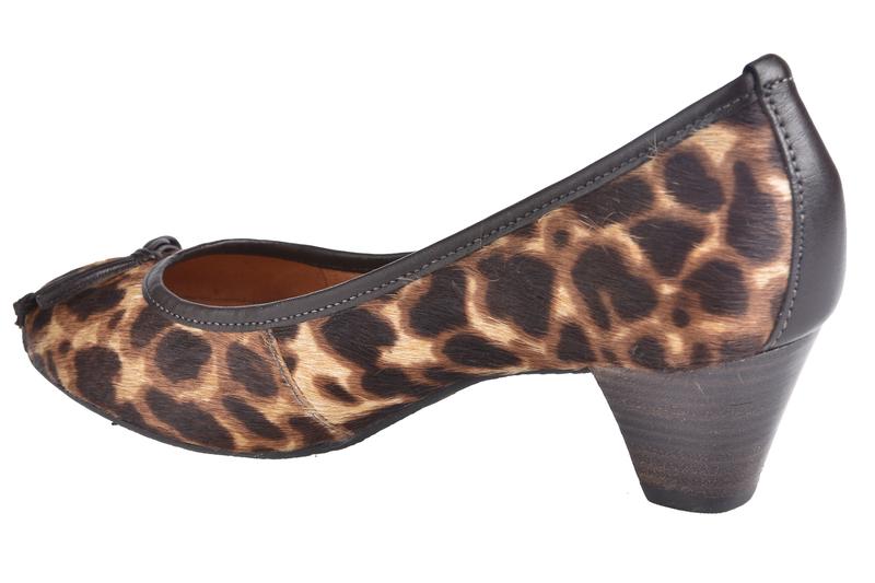 Bailarina tipo rock and roll fabricada en serrajeluxe de imitación jaguar y puntera negra de charol con tacón cubano de 4 centímetros.