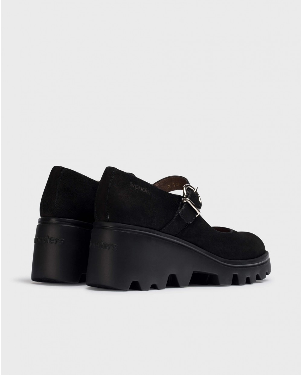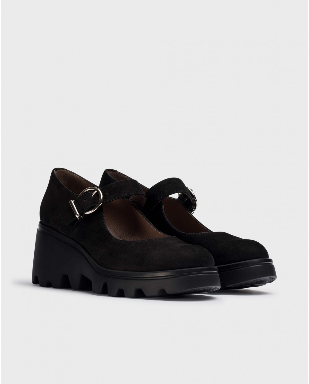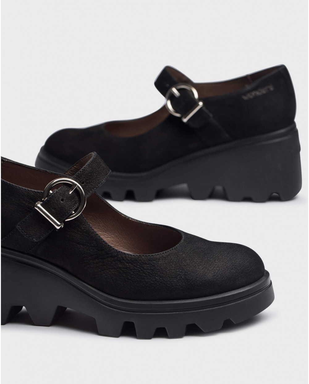 - Merceditas VALENTINA confeccionadas en piel ante color negro. Este modelo se caracteriza por su cierre mediante hebilla y su suela track, desarrollada con tecnología WondersFly™ que garantiza ligereza y confort.