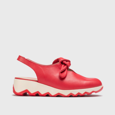 Zapatos destalonados AIXA, fabricados en piel lisa color rojo. Este diseño atemporal destaca por su delicado lazo en la parte delantera y un elástico en la tira trasera que asegura un ajuste perfecto.