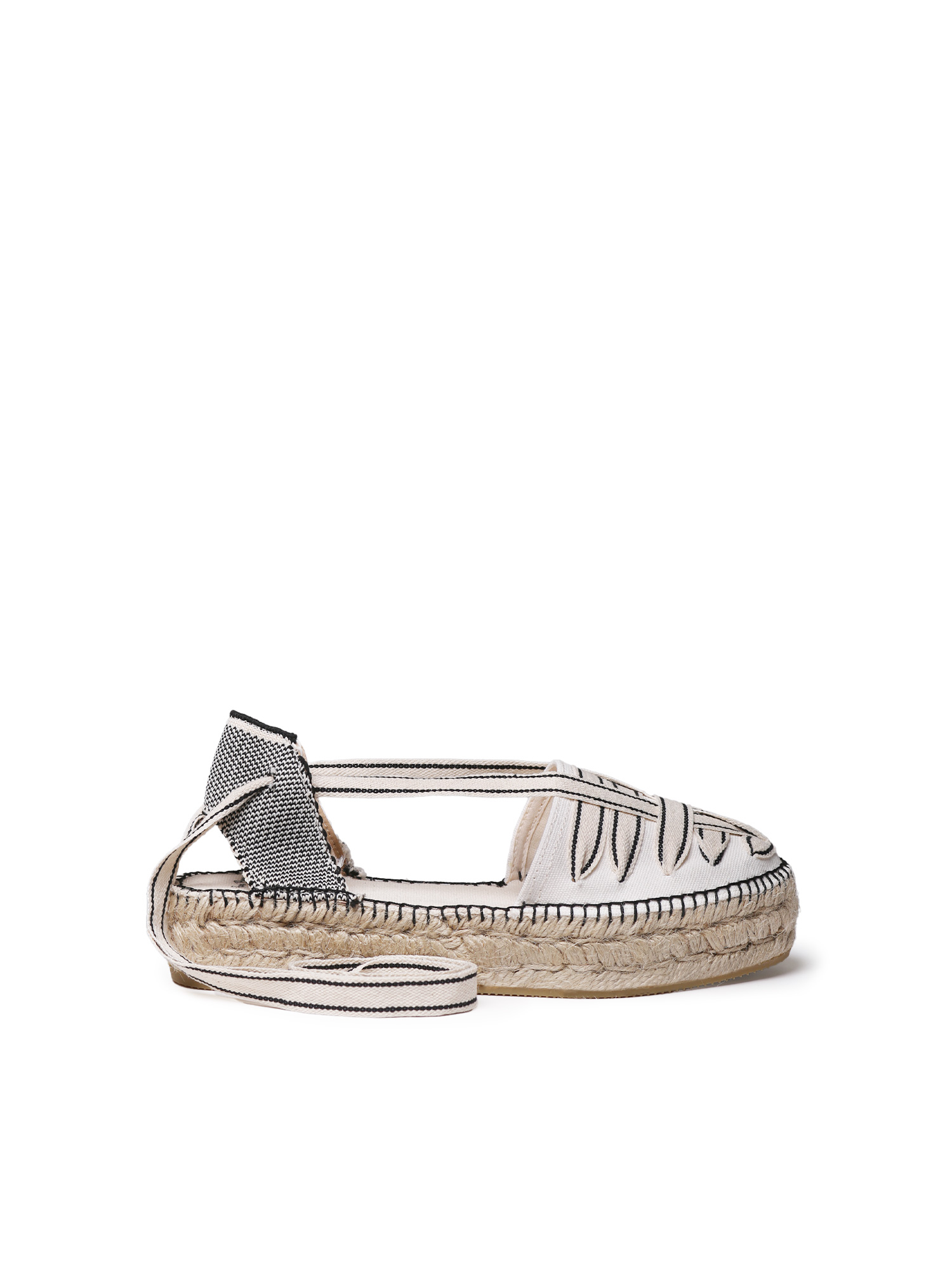 LIONETTE. Aquesta espardenya per a dona amb tires creuades forma part de la col·lecció càpsula Toni Pons & Sita Murt. Està confeccionada en teixit de cotó. És un model tancat que s’ajusta mitjançant dues vetes bicolor com a tancament. La sola de jute té una alçada de 3,5 cm i compta amb una base de goma antilliscant per oferir més estabilitat.
