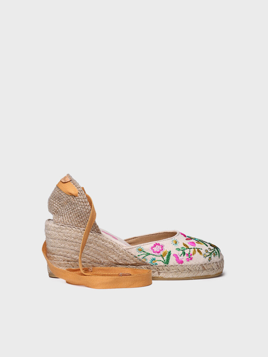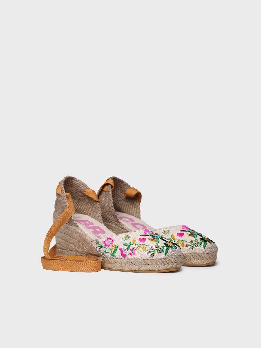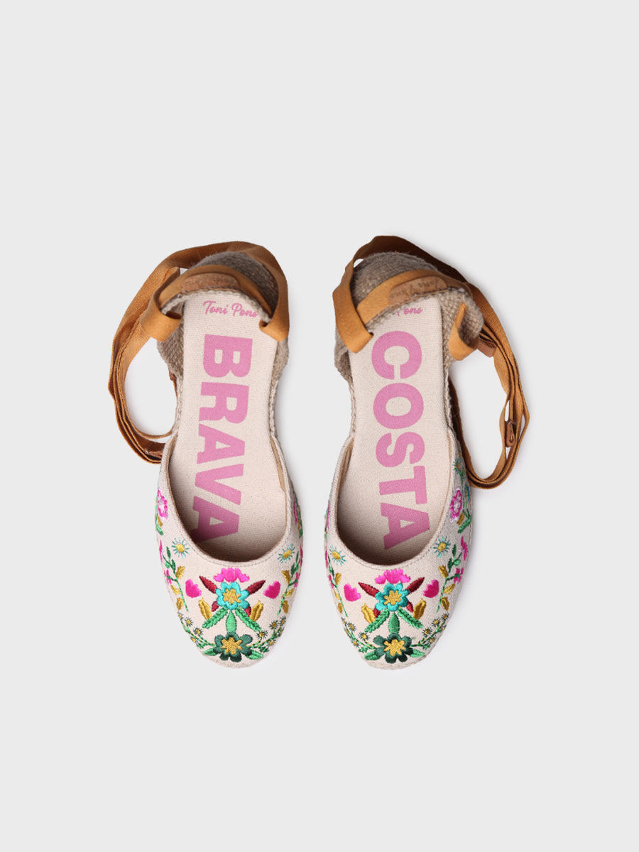 CASTELL. Aquesta espardenya forma part de la col·lecció càpsula Costa Brava. Es tracta de la clàssica espardenya valenciana de taló de cintes amb brodats multicolor.