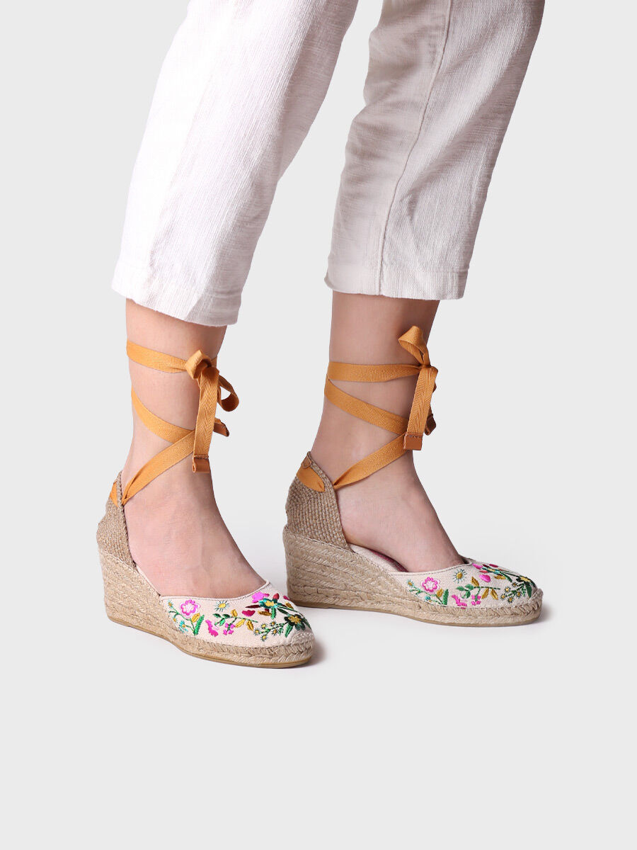 CASTELL. Esta alpargata forma parte de la colección cápsula Costa Brava. Se trata de la clásica alpargata valenciana de cuña de cintas con llamativos bordados multicolor. La cuña de yute tiene una altura total de 7 cm, de los cuales 5 cm pertenecen al tacón y 2 cm a la suela. La base de la suela es de goma antideslizante. Es una alpargata 100% vegana. Este modelo calza la talla habitual, si estás entre dos tallas te recomendamos escoger la más grande.